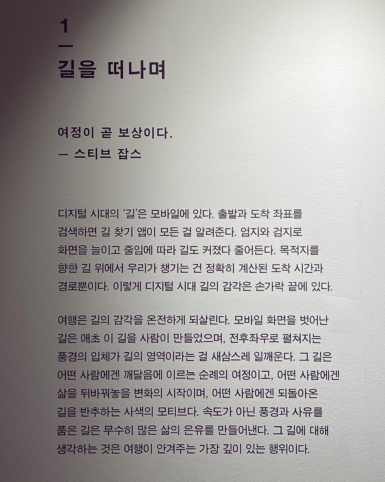 특히 이번 전시는 글이 참 마음에 들었다. 사실 전시장에서 술술 읽히는 안내문을 만나는 일은 서울에서 오로라를 볼 확률만큼, 아예 없는 거나 마찬가지라고 생각해서 더 놀랍고 반가웠다. 다음 캡션은 뭐라고 쓰여있을까, 다음 여행지는 어떻게 소개되었을까 궁금해지는 글이었다. 잘 쓰인 글 덕분에 전체적으로 책을 전시장에 옮겨놓은 것 같은 느낌이 들었다. 인문학적으로도 뜯어보고 이야기 나눌 만한 포인트가 많아서 나한테는 아주 매력적인 전시였다.