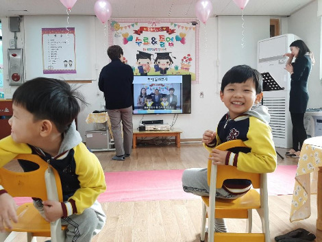 사내아이 두 명, 졸업 가운을 입고 의젓하게 앉아 있다가, 엄마 아빠가 가니 날뛰기 시작했다. 이날이 선생님들과 마지막 날이 될 거라고, 들었지만, 이해하지 못한 아이들은 마냥 신났다. ‘밝은 미소 인사상’과 ‘하하 호호 웃음상’을 각각 받은 아이들답게, 장난과 웃음이 떠나지 않았다. 아이들과 달리 두 분 선생님의 얼굴에는 만감이 교차하는 게 느껴졌다. 그리고 결국,