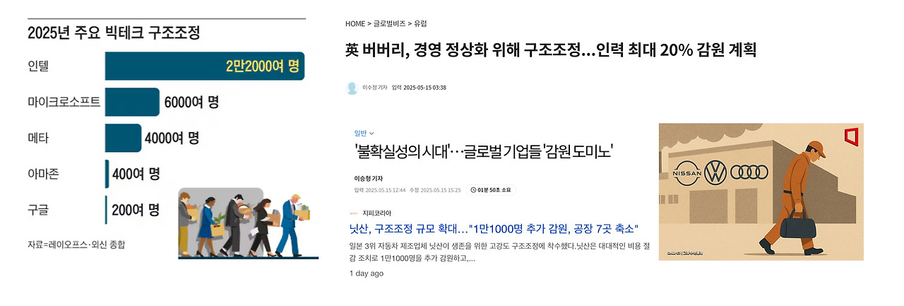 실제로 최근 2년간 구조조정을 시행한 글로벌 대기업들의 수가 크게 늘어났으며, 최근에도 마이크로소프트, 아우디, 닛산 등 글로벌 기업들이 감원 계획을 발표했다. 미국의 1분기 GDP 성장률이 3년 만에 처음으로 마이너스를 기록하면서, 경기침체 가능성에 대한 우려는 더욱 커지고 있다.