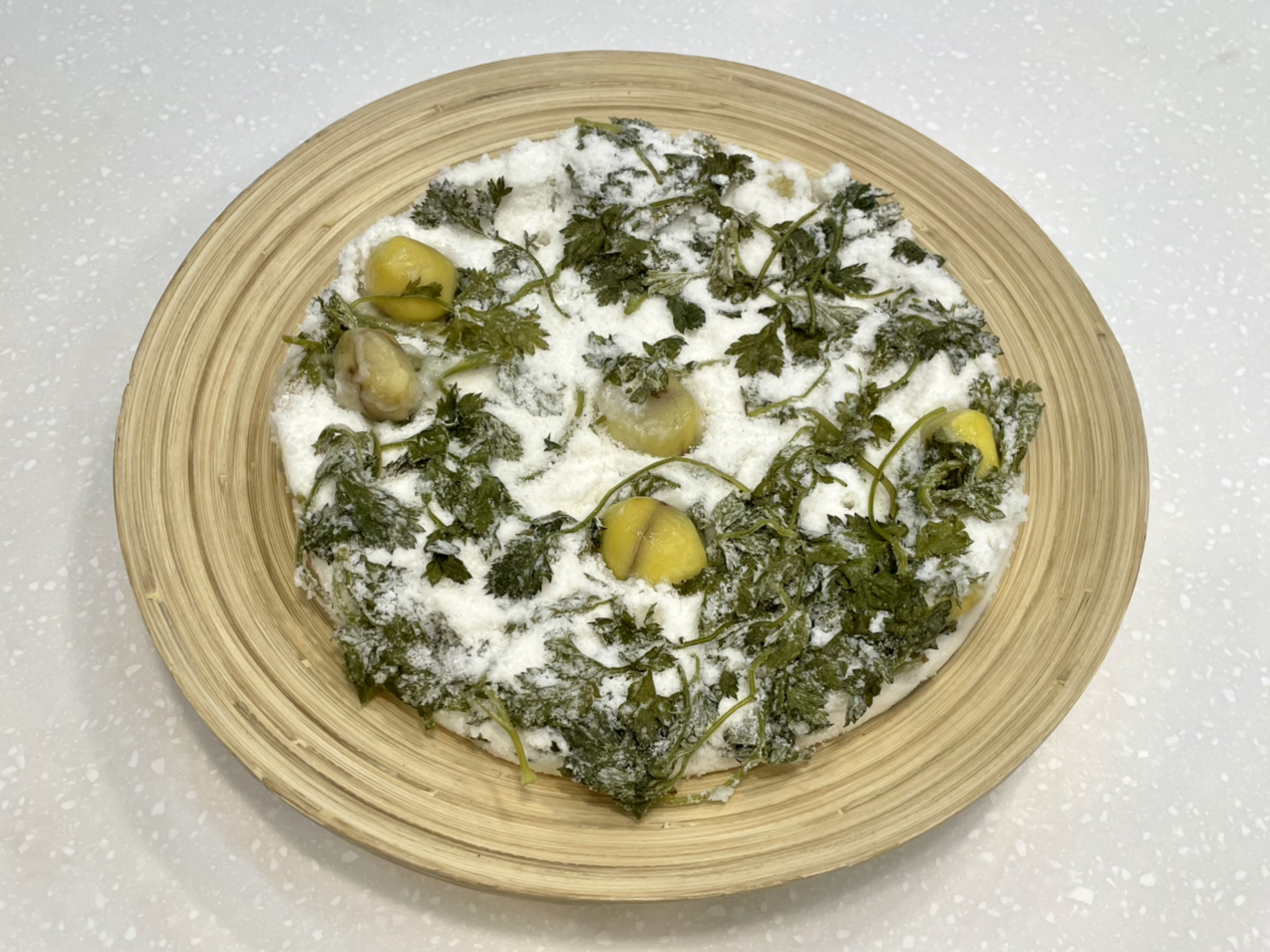 쑥은 조금만 자라면 식감이 질깃해진다. 이물질을 제거 한 쑥의 여린 잎을 흐르는 물에 깨끗이 씻은 후, 마른 밀가루로 덧가루를 묻혔다. 여기에 튀김가루에 감자전분을 살짝 섞고, 차가운 물을 더해 튀김옷을 만들었다.