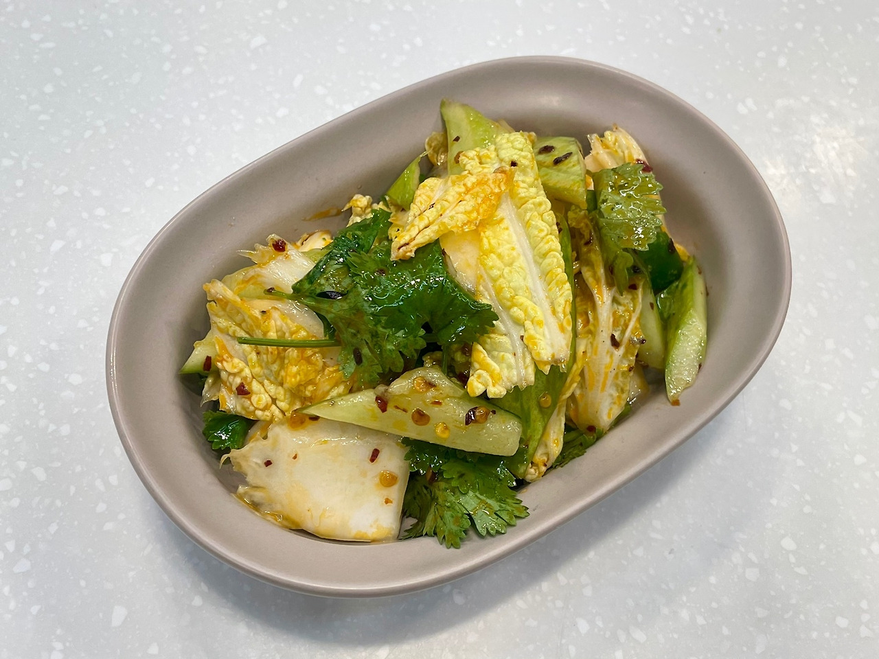 오이는 씻어서 가시를 제거하고 막 두드린다. 마늘을 빻는 방망이를 이용하면 좋다. 힘껏 두드려 수분감과 오이의 향이 팡팡 터지게 만든 후에 알배기배추를 먹기 좋게 잘라 소금을 넣고 오이와 함께 살짝 절였다. 충분히 절인 후에 설탕과 식초를 넣고 중국집에서 맛있게 먹었던 라조장을 조금 넣어줬다. 고추기름과 함께 매콤한 감칠맛을 내는 라조장은 오이의 시원함과 어우러져서 매력적인 맛을 낸다. 이 오이무침에는 고수를 꼭 넣어줘야 한다.