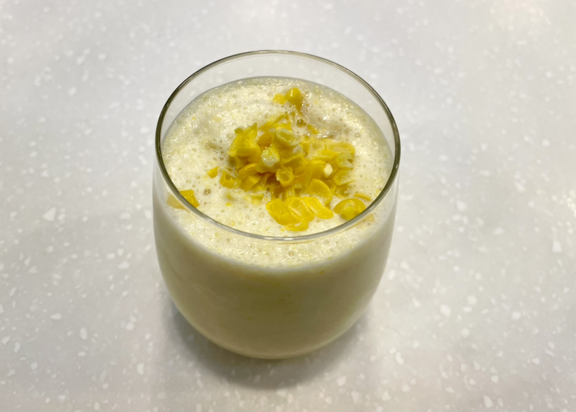초당옥수수는 랩을 씌워서 전자레인지에 3-4분 정도 돌린 후에 한 김 식혀 알갱이만 분리했다. 분리한 초당옥수수에 우유와 바닐라 아이스크림을 한 스쿱 넣고 갈아줬다. 여기에 겉면을 살짝 익혀 준 초당옥수수를 가니쉬로 올려내면 맛있는 초당옥수수라떼를 완성할 수 있다. 바닐라 아이스크림의 단맛과 초당옥수수의 단맛이 충분하기 때문에 설탕이나 연유 등 단맛이 나는 다른 재료들을 넣지 않아도 된다.