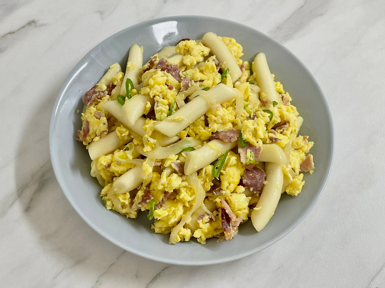 팬에 베이컨을 볶다가 베이컨이 노릇노릇 해지만 버터 한 조각을 넣고 양파와 대파를 넣어 투명해질 때까지 볶는다. 올리브 오일에 버무려 둔 떡볶이 떡을 넣고 볶다가 소금과 후추, 약간의 설탕을 넣어 간을 한다. 떡이 말랑말랑해지면 풀어둔 달걀을 넣고 스크램블을 해주면 완성이다.