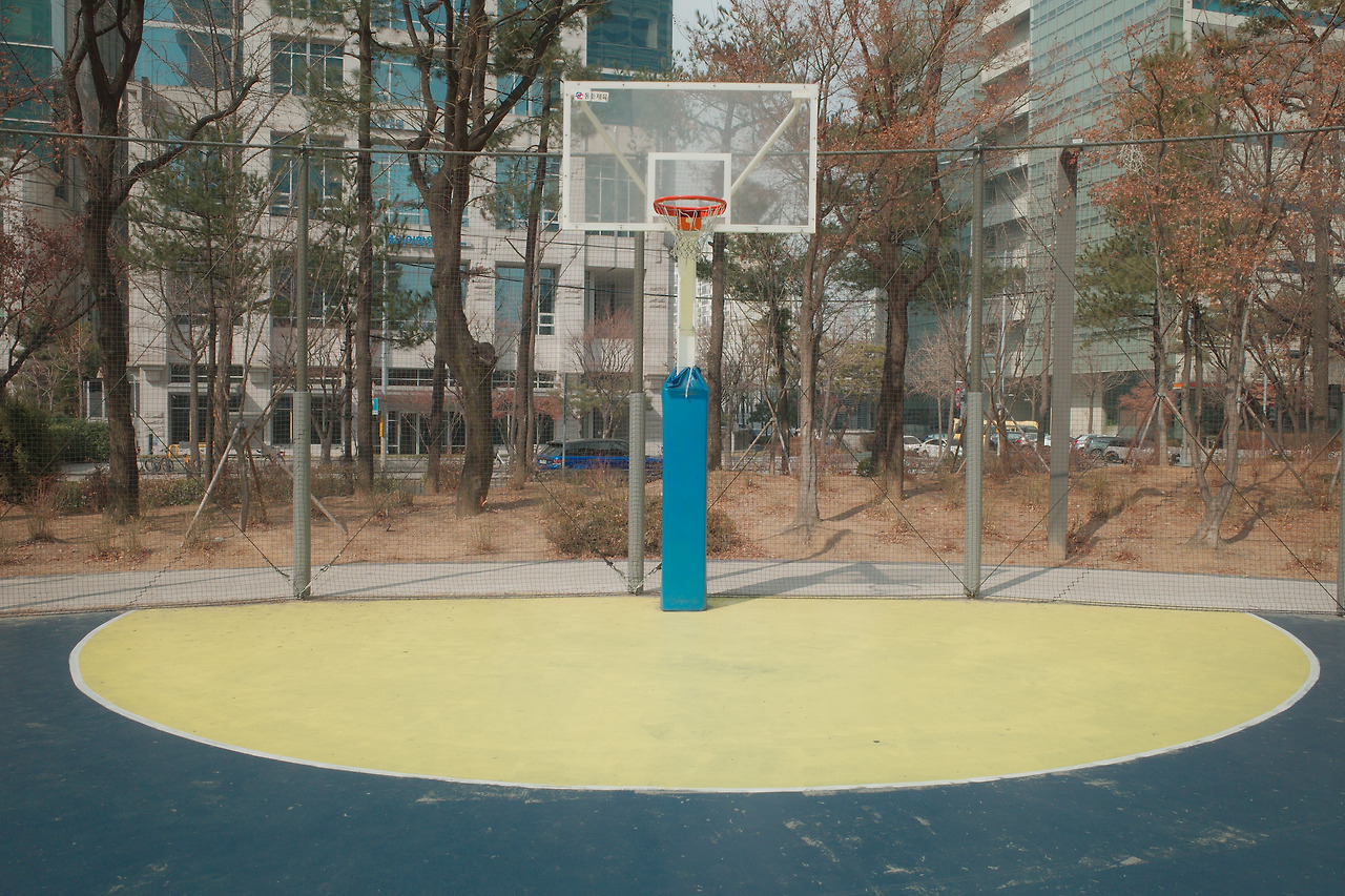 어쨌든 오목공원은 확실히 사회적 거리감을 존중한 공간이다. 1980년대의 정직한 도시계획 위에 2020년대의 섬세한 감정 설계가 더해진 이곳은, 거리감의 적정선을 물리적 공간으로 제안한다. 공원 중앙부에 놓인 정사각형 회랑 덮개, 4-5미터 정도 되어 보이는 2층 산책로의 폭원, 한 변의 길이가 40-50미터 정도 되어 보이는 네모난 잔디밭과 다섯 그루의 느티나무, 네이비색-레몬색의 농구장 공간과 분리된 일반 운동기구 공간—이 공원은 도시와 개인, 감정과 행동 사이의 이상적 거리감을 실험하는 공공 공간이다.