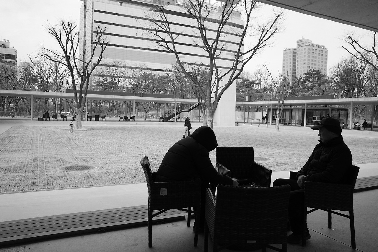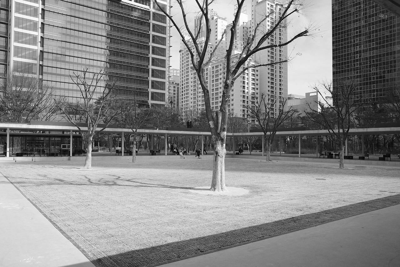 공원 중심부에 자리한 사각형의 잔디밭과 회랑 덮개를 살펴보자. 사실 정방형의 정직함은 안정감을 줄 수도 있지만 자칫하면 지루함과 경직됨으로 느껴질 수도 있다. 누군가에겐 공간이 좁아 보이고 답답하게 느껴질 수도, 육중한 회색 콘크리트 구조물이 다소 무겁고 인공적으로 보일 수도, 명료한 건축적 접근이 날카롭고 차갑게 보일 수도 있다. 그러나 다행히 우려했던 바는 크게 일어나지 않았다. 정사각형 회랑 안의 잔디밭에 심긴 다섯 그루의 느티나무 거목들 덕분이다. 회랑이 90도로 꺾이는 곳에 드러나는 날카로운 엣지(edge)를 느티나무들이 절묘하게 흐트러뜨린다. 소실점은 삐걱거리며 뒤틀린다. 네모난 형태가 유발하는 구조적 긴장감과 경직성을 나무와 녹색의 자연이 완충해 주는 것이다. 그러한 쿠션감이 이용자에게 심리적 안정감을 제공한다.