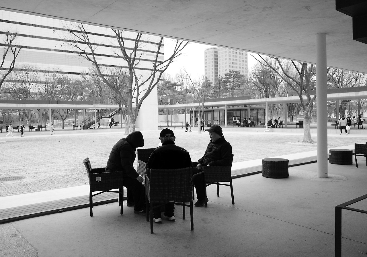 몸짓과 손짓정도만 뿌옇게 읽히기 때문에 마주 보고 앉아도 민망하지 않고 혼자여도 그리 외롭지 않다. 가운데 네모난 잔디밭에서 뛰노는 아이들의 모습도 아이나 보호자나 구경꾼 모두에게 그리 부담스럽지 않다. 적당한 거리에서 자신을 뽐내고 드러낼 수 있다는 안도감. 그런 상대방을 바라보는 여유감. 이 희극적인 무대에서 서로의 암묵적 동의를 느낄 수 있다.