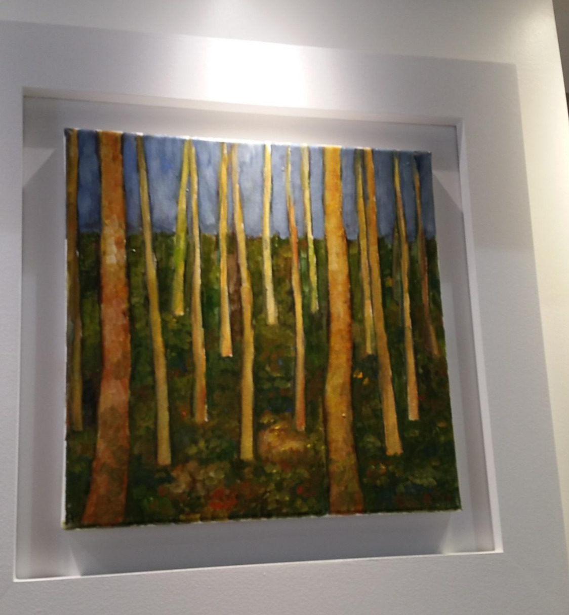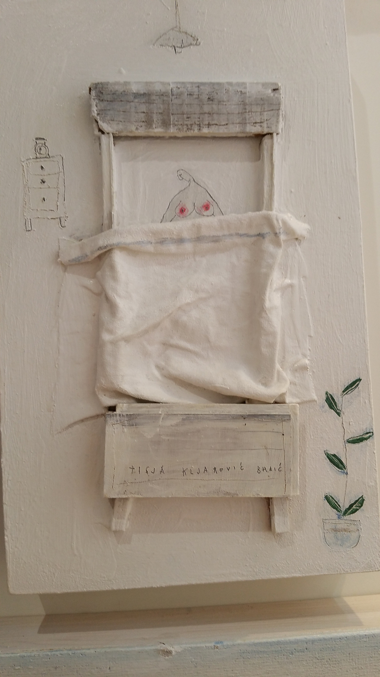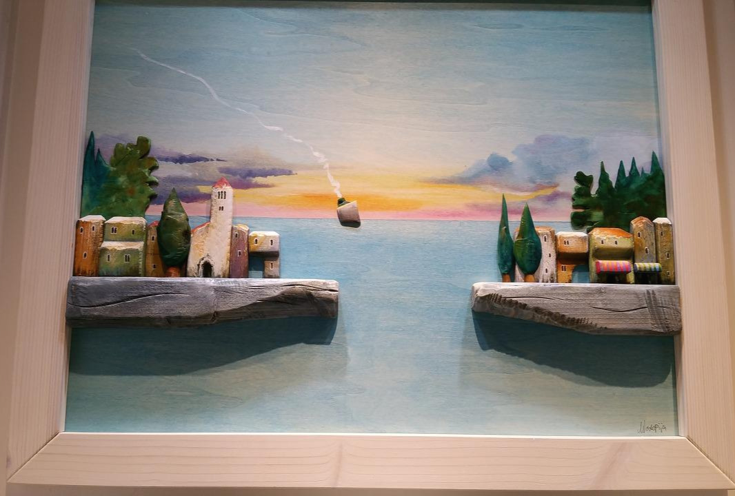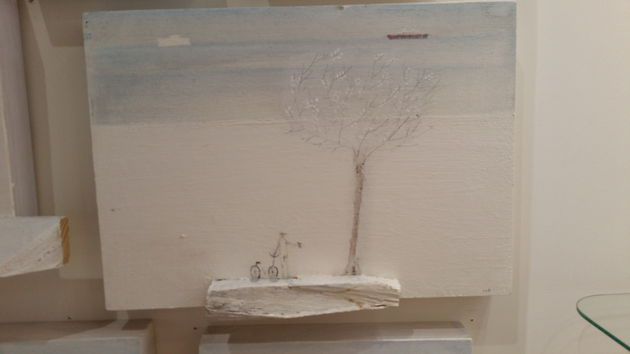 여러 재료를 캔버스에 붙여 표현해 낸, 단순하지만 입체적인 소품들이 눈길을 끈다.