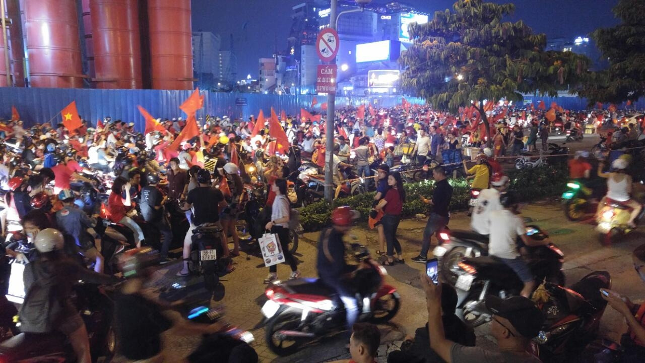 길을 지나던 외국인을 포함한 시민들 모두가 이 환호의 대열에 합류, 외국인 관광객들도 깃발을 나눠 흔들고 천을 두르며 경적 소리에 맞춰 춤추고 소리치며 마음을 합한다. 각종 경적으로 주고받는 행진대의 무언의 협응은 그칠 줄 모른다. 벤탄 시장 앞을 통과해야 숙소로 돌아가는데, 사람들 사이를 뚫고 지나갈 수가 없다.