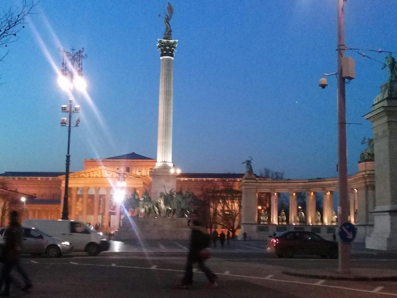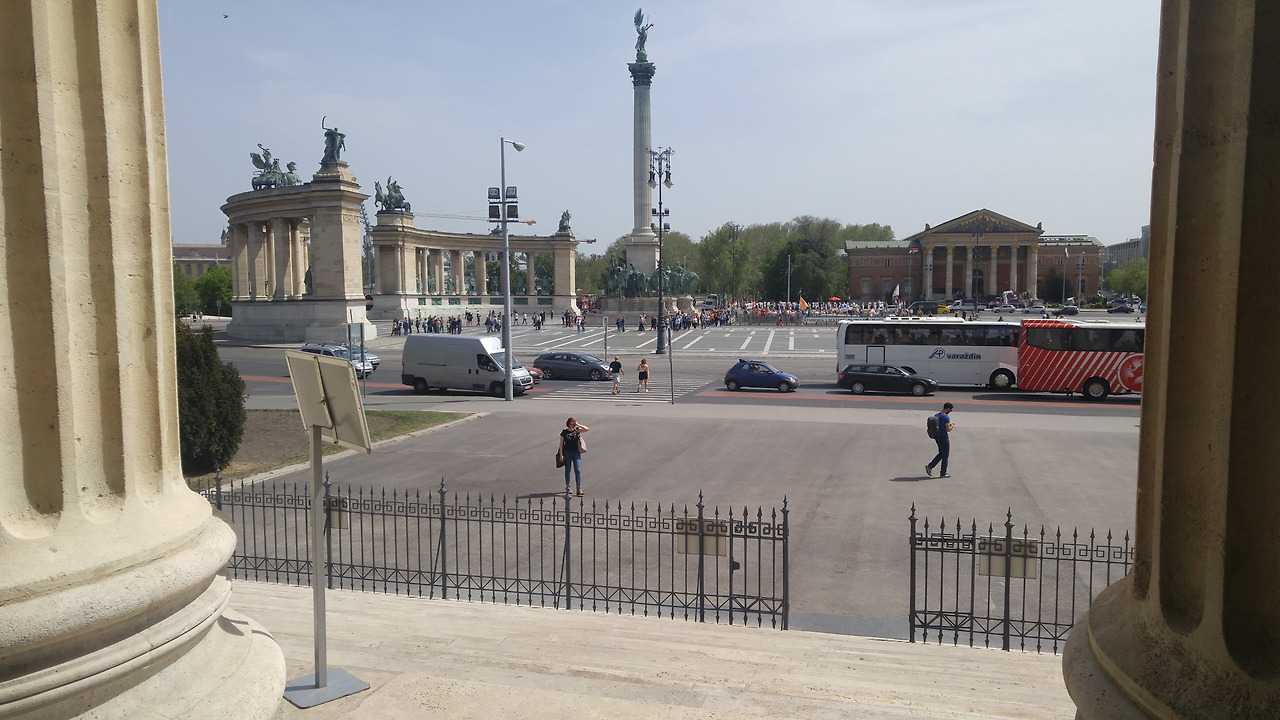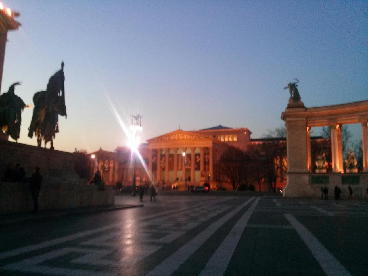 광장 너머 보이는 중앙의 미술 괸 전경: 왼쪽 기마상 실루엣은 마자르 부족장들의 모습