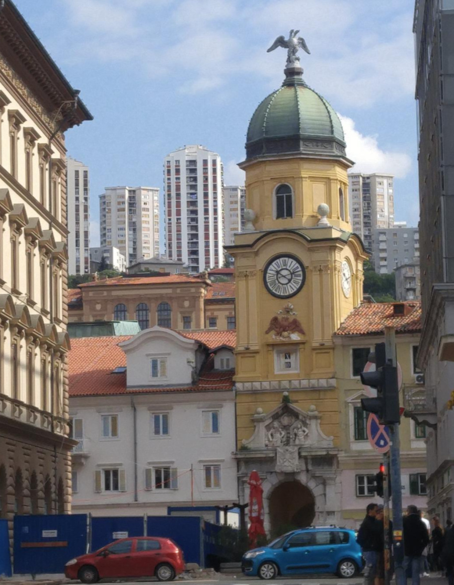 시 첨탑 아래의 문. 쌍두 독수리는 리예카 시의 문장