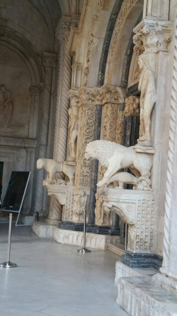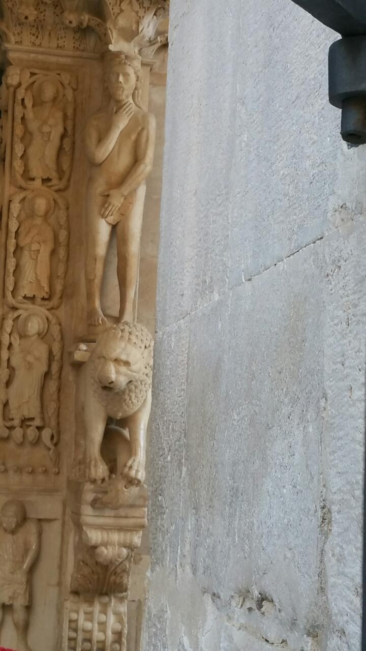 사자 조각 위에 몸을 가리고 있는 아담과 이브의 동상은 이름 높은 트로기르 태생 조각가 라도반의 1240년 작품으로 아담과 이브의 조각은 달마티아 지방에서 가장 오래된 것이라고 한다. 누드여야 하는 아담과 이브 조각의 공식적 첫 데뷔라고나 할까...