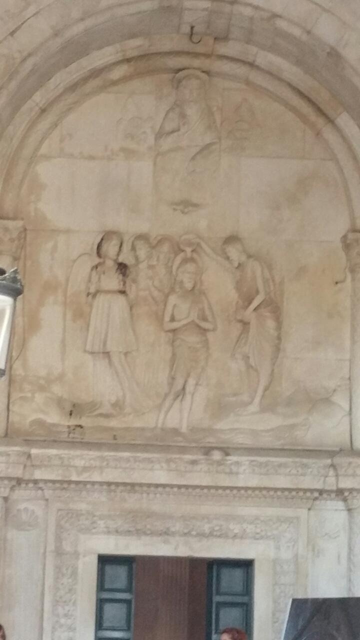 로렌스 성당 입구 1467년 안드레아 야레시(Andrija Aleši) 작품, 세례 성수반 '세례 요한으로부터 세례를 받고 있는 예수님'