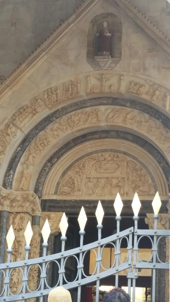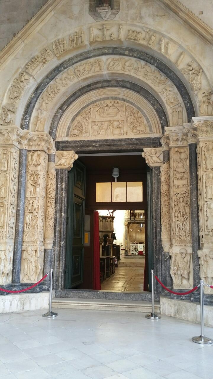 로렌스 성당 입구 '라도반의 문' 트로기르 태생 조각가 라도반의 1240년 작품, 사자 위에서 몸 가리고 서있는 아담과 이브 기둥의 첫 번째 줄은 성인들, 두 번째는 계절과 관련된 풍속 행사, 세 번째는 일상생활 장면과 여러 동식물이 조각되어 있다.