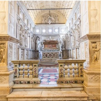 르네상스 양식의 탑 정면과 내부의 조각품은 Niccolò Fiorentino의 작품이다.