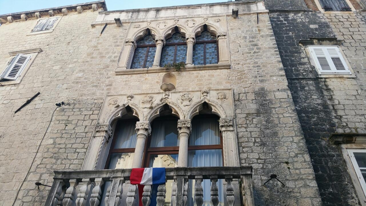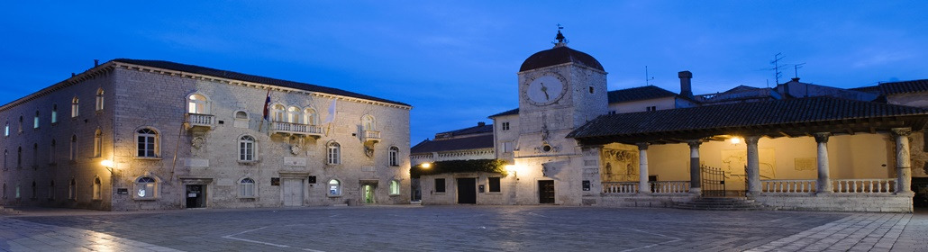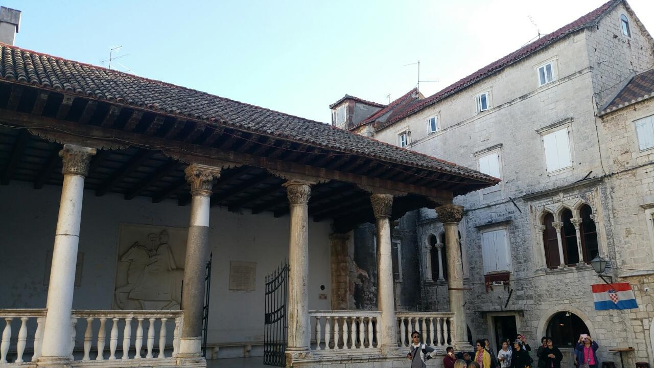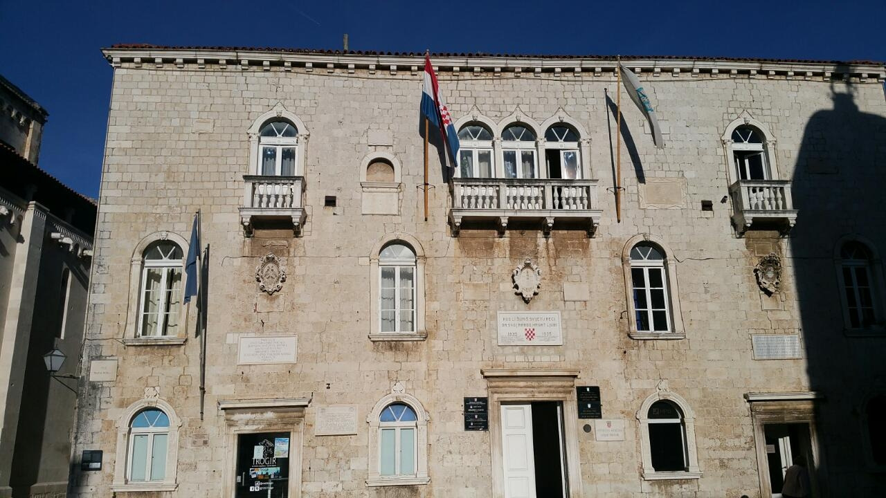크로아티아 국기가 걸려있는 광장 동쪽에 보이는 아담한 3층 건물이 트로기르 시청이다.