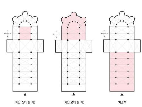 성당 평면도 맨 윗부분 반원형 3곳이 apse성당 평면도의 회중석은 nave라고 하며 제대를 향해 신자들 의자가 놓인 공간이다.