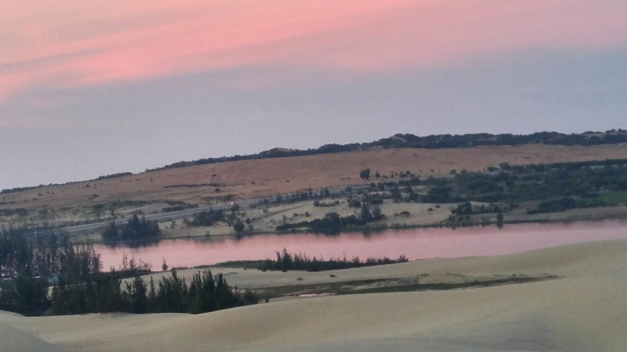 눈을 들어보니 굽이굽이 진 모래언덕 사이로, 고즈넉이 누워있는 호수가 있다. 2.7km 길이에 500m 폭이라는 호수는 여명을 담은 분홍빛 구름을 담아 실키한 핑크빛 보울이 되어있다.