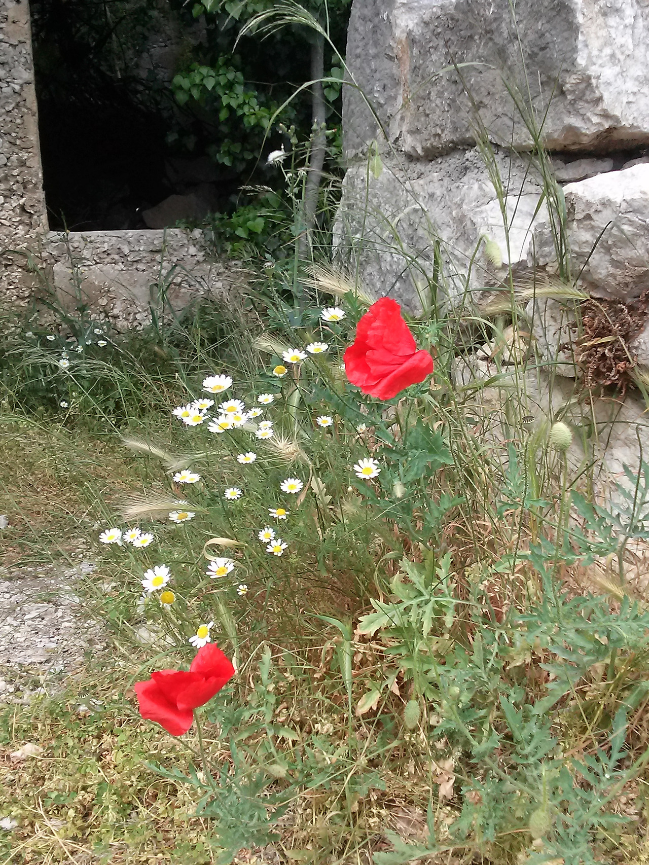 오래된 돌 틈 사이를 뚫고 피어난 야생화는 거친 회색 돌 벽과 대비되어 황홀한 보라 색감으로 청초함을 한껏 뿜어내고 있다.