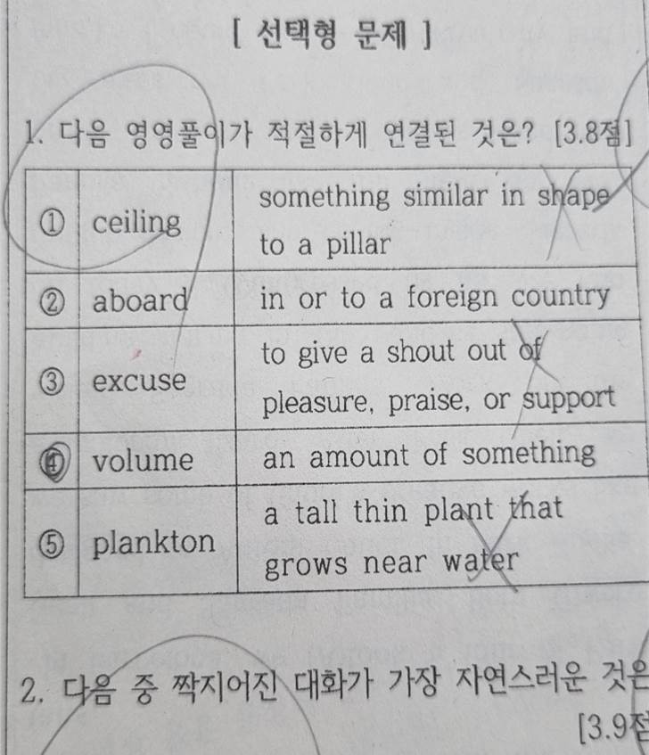 가장 쉬운 1번으로 가져왔습니다. 아실만한 영단어들입니다. 영영풀이를 외운 우리 아이들도 쉽게 맞힐 문제입니다. 그런데, 2번 보기 abroad (해외로) 또한 맞는 영영풀이죠? 답이 2개여야 하는 거 아니냐고요? 잘 보세요. 쌩뚱맞은 'aboard(탑승한)'였네요. 이런 문제는 대치동에서 흔합니다. 심지어 message와 massage를 바꿔 써놓고 장문 독해 속 '틀린 어법 찾기'로 내기도 합니다. 난이도로 변별력을 주지 않는 괴랄한 출제입니다. 그래도 이건 애교로 보입니다. 충분히 이해 가능한 범주입니다.
