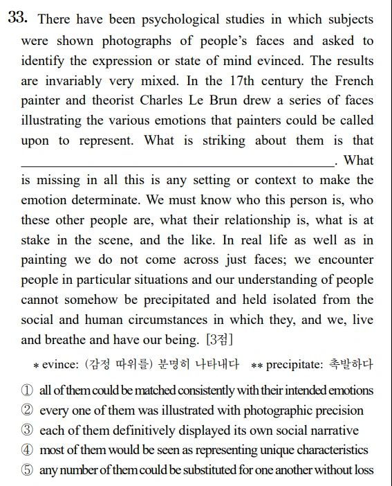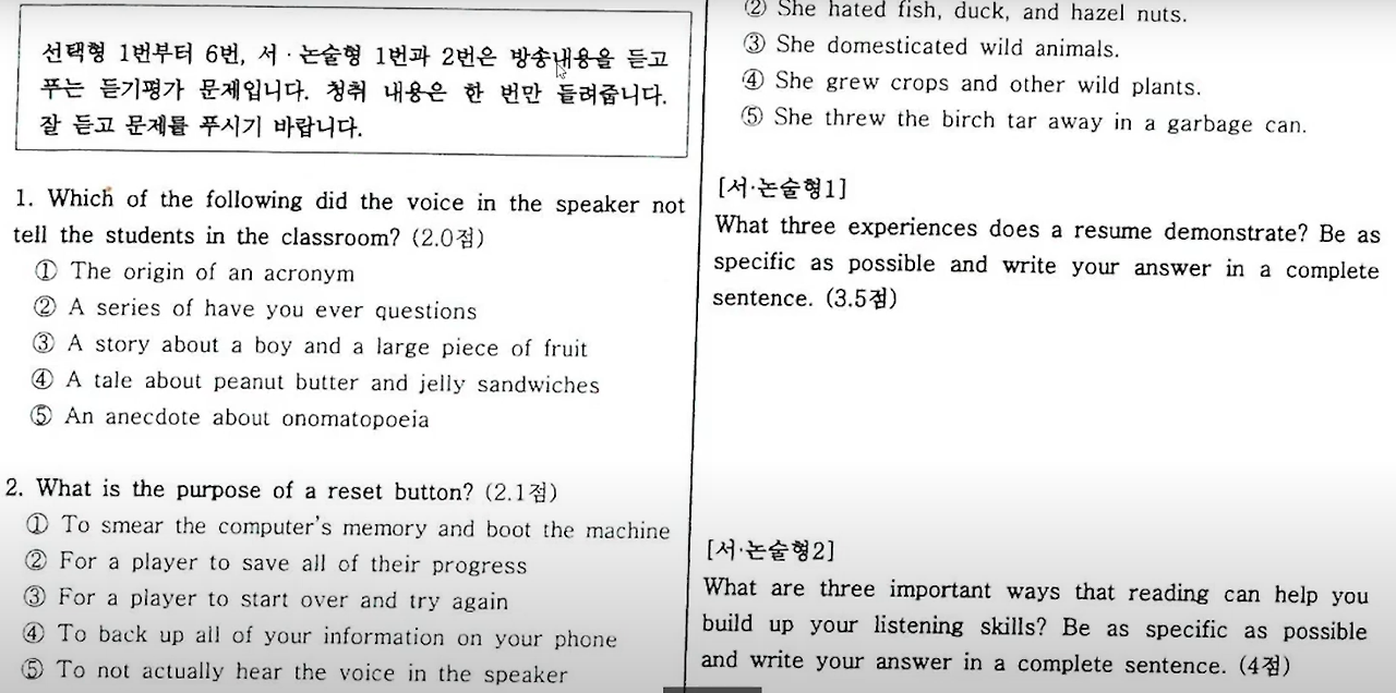 아시다시피, 소위 ‘갓반고’라 칭하는 대치권 고등학교들은 내신이 수능보다 훨씬 어렵습니다. 비교가 안됩니다. 일단 수능은 100% 객관식이죠. 빈칸추론? 요약문 완성? 어렵긴 하지만 보기 중에 1개를 고를 수가 있어요. 하지만 내신은 '모두' 고르시오, 그리고 서술형이 있죠. 빈칸 2-3개 채우기면 다행이고요. 7-8단어 이상이면 큰일니다. 빈칸, 요약문? 다 내가 써야 돼요. 한글 뜻 주면 다행이고요, 그나마도 안 주면 알아서 해야해요. 대치권 고등학교 영어 내신 문제를 보시겠습니다.