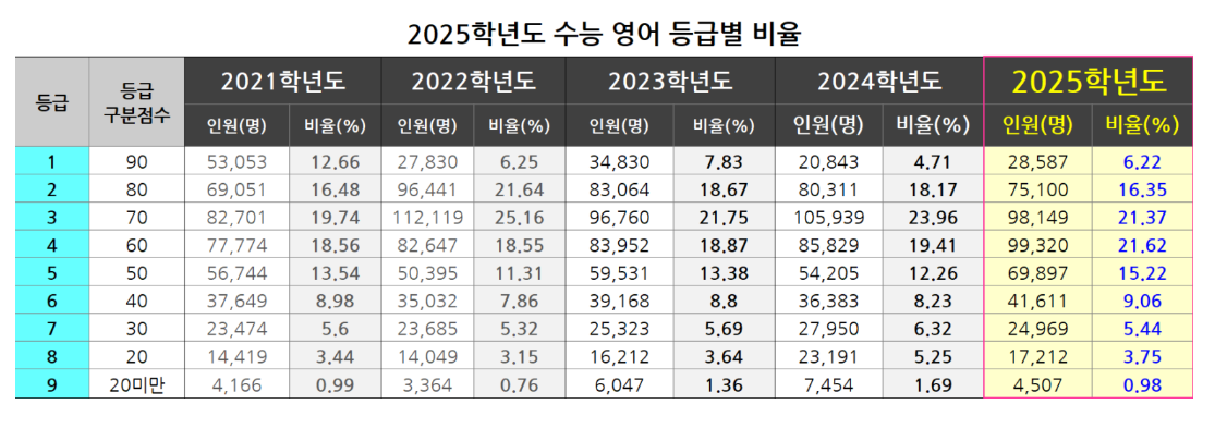 저는 올수도 불수능 (내지는 핵불)이었다고 봅니다. 해가 갈수록 아이들의 학력 전반은 하락하고 양극화는 심화되지만 시험은 절대 쉬워질 일 없습니다. 절대평가라고 영어를 만만하게 봤다면 반드시 댓가를 치르게 됩니다. 그래도 영어는 절대평가인데 비교적 편한 과목 아니냐고요? 우리 아이가 중등까지 '밑천'이 마련되지 않았다면 수능 1등급(90점)은 커녕, 2등급(80점)의 문턱도 생각보다 높다는 것을 아셔야 합니다. 대부분 아이들은 이걸 고등 가서 깨닫습니다. 그러면 늦어도 너무 늦습니다. 학부모님들도 "수학도, 국어도 아니고 영어 때문에 대학 지원이 막힐 줄은 꿈에도 몰랐다"고 하십니다. 일찍 눈 뜨실 수록 좋습니다. 공부의 올바른 첫 걸음은 ‘현실 인지’로부터 시작합니다.