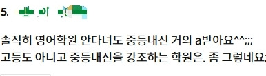 속지 마세요. 중등 내신을 바라보고 수업하는 중등 학원들과 선생님들은 잘못됐습니다. 아이가 첫째 거나 외동인 경우 마음만 급하고 아무것도 모르십니다. 보여드린 대로, 국내 교육과정상 영어는 하루아침에 뒤통수를 치며 모든 방면에서 개연성이 매우 희박합니다. 중등 내신용 공부는 효용이 낮고, 고등 요구 학력은 고등부 가서 해봤자 안됩니다.