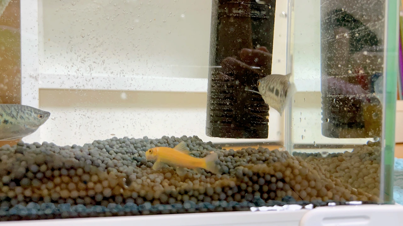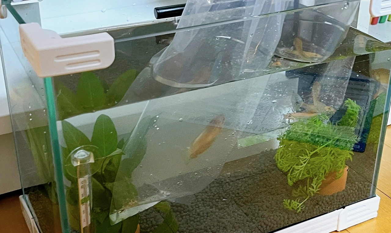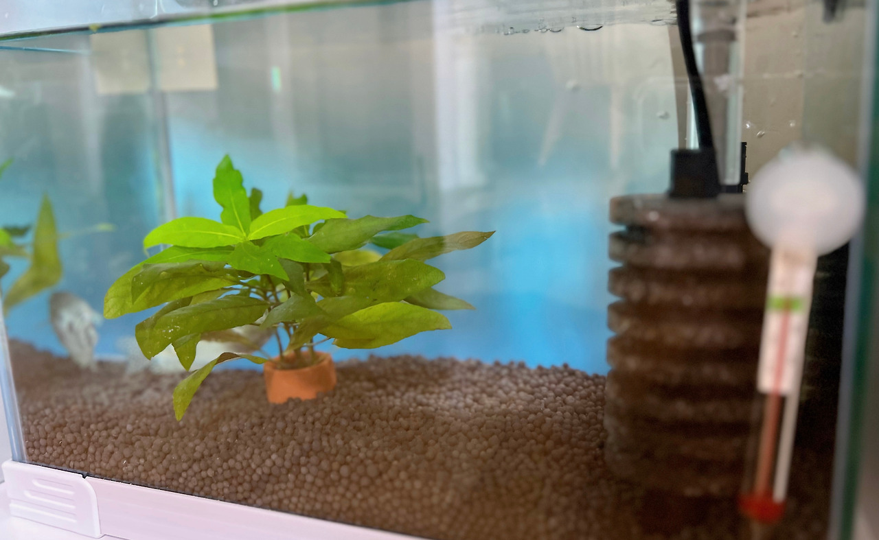 다행히 우리의 구세주는 근무 중이셨다. 집에 오는 장바구니에는 초심자가 감당할 마음 크기에 그나마 비례하는 스몰 사이즈 어항, 측면 여과기, 박테리아가 한 통에 든 ‘스타터 세트’가 담겼다. 이끼가 잘 안 낀다는 자갈, 생물 수초 화분 두 개, 물고기를 옮기는 망도 같이 왔다. 중요한 것은 새로운 가족도 함께라는 사실이다. 금색, 은색 구라미 두 마리와 ‘청소 물고기’로 알려져 있다는 알지이터 두 마리.