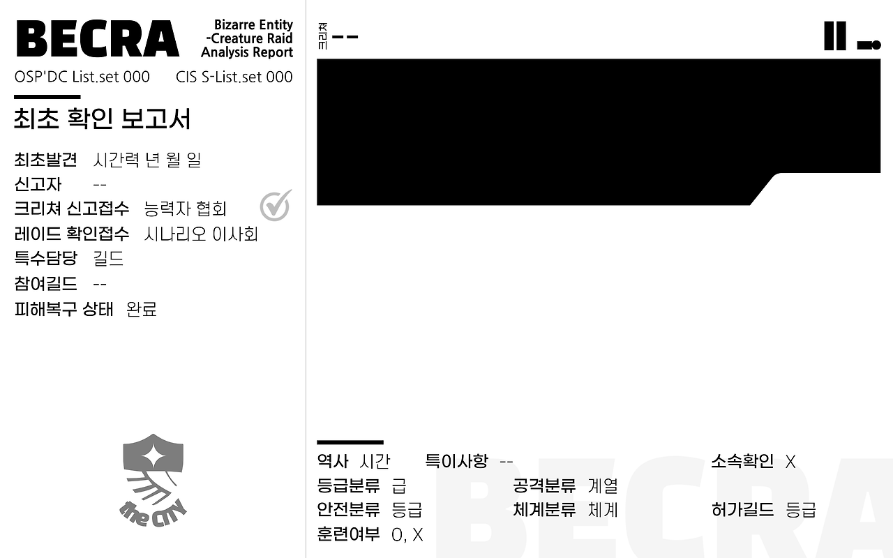 크리쳐 레이드 분석보고서는 베크라 BECRA라고 부른다. 기괴 존재-크리쳐 레이드 분석보고서(Bizarre Entity-Creature Raid Analysis Report)의 약자다.