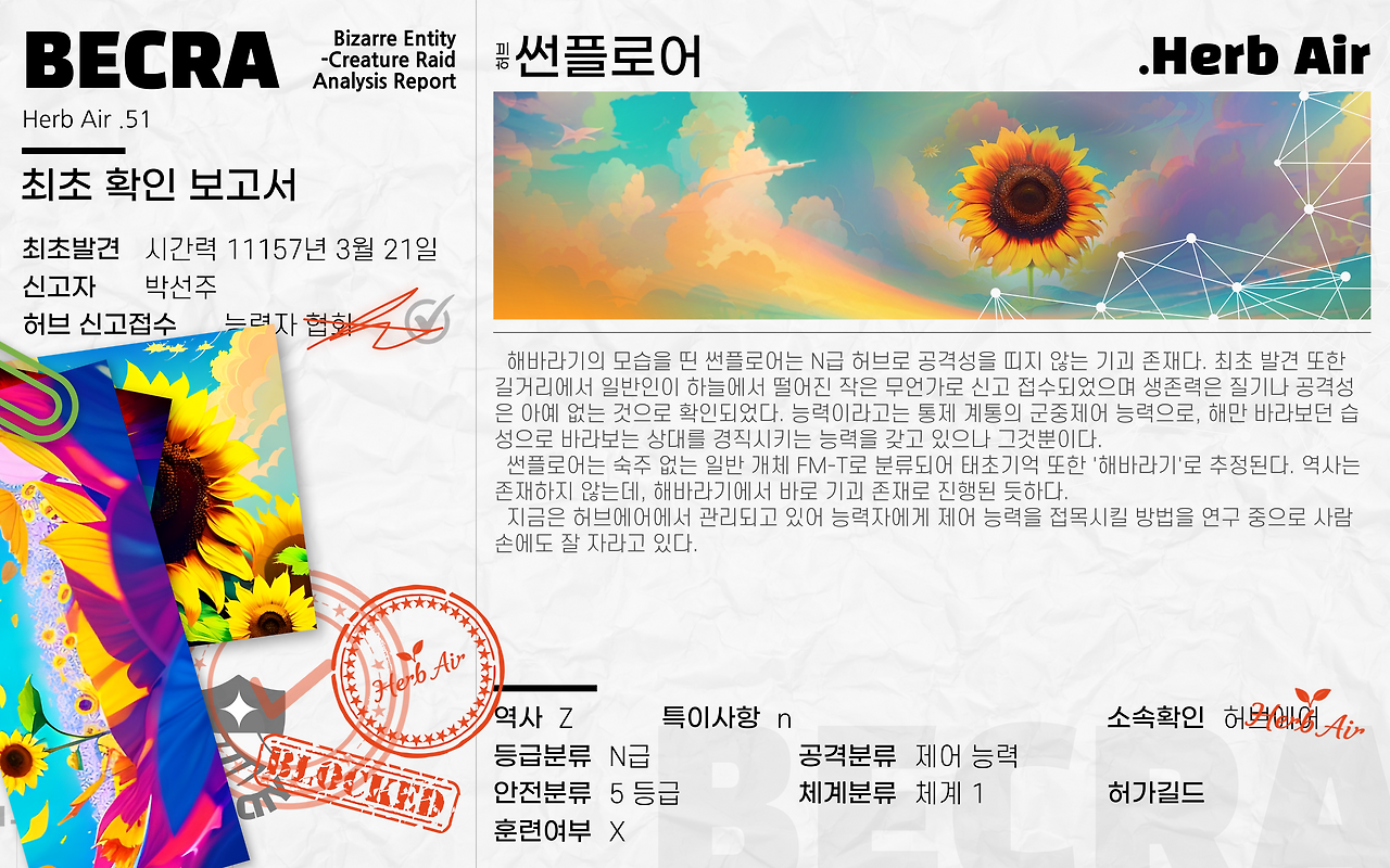 접수된 신고는 CIS 국제연구센터를 지나 허브에어로 자동 인계되어 허브에어에서 바로 출동하여 썬플로어 21개체를 포획할 수 있었다. 내부 테스트로 생존력은 일반 권총 15발에 완벽한 죽음을 겪는다고 한다. 하지만 공격성은 존재하지 않으며, 상대에게 통제 계통의 군중제어 경직 및 교란을 일으킨다. 최대 50 개체까지 확인되며 시전 거리는 20m 내외다.
