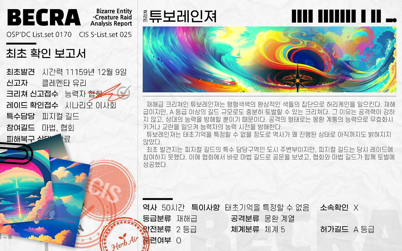 [[재해급 크리쳐 튜보레인져]]의 최초 발견 장소는 도시 주변부이다. 형태를 특정할 수 없는 모습과 끝없는 하늘을 뒤덮는 그 위엄에 재해급으로 분류되었음에도 A등급의 길드 규모라면 충분히 토벌할 수 있는 크리쳐다. 최초 신고 및 발견자인 클레멘타 유리 씨는 황홀한 느낌이 좋았다며 집에 귀가해 베란다에서 하늘을 보던 중 어떤 빛의 눈과 마주쳤다며 알 수 없는 세계를 다녀왔다고 신고했다. 능력자 협회는 접수 후 바로 CIS로 긴급 공문을 보내고 확인한 결과 튜보레인져가 하늘을 덮은 지 하루의 시간이 지났다고 하며 지면에 떨어지는 다른 기괴 존재들과 달리 하늘을 부유하는 모습이다.