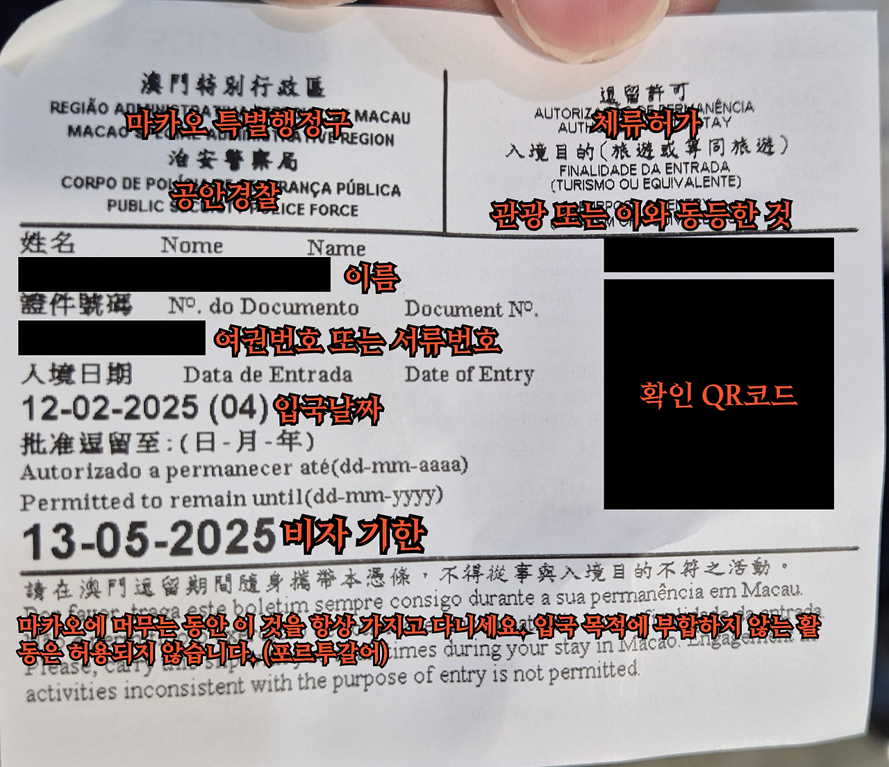 아무래도 마카오가 세계최대규모의 카지노 도시이기도 하고, 관광도시이다 보니 불법체류자가 많다고 한다. 그래서 이 체류허가 비자 종이를 통해 이 사람이 관광 등의 체류 중인지, 아니면 기한이 지난 신고되지 않은 불법체류자인지 알 수 있다고 한다. 우리의 눈에는 보이지 않는 사복경찰이 있다고 하는데, 그들이 불법체류자를 가려내기 위한 불시검문을 한다. 그때 이 종이를 보여주면서 여행 목적으로 체류 중이라는 것을 알리면 된다.