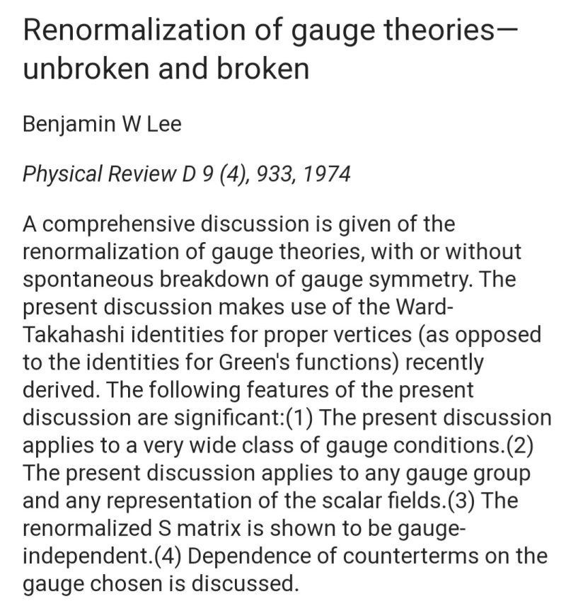 하지만 와인버그 모형에서는 이론에서 중요한 요건 중에 하나인 재규격화를 해결하지 못했다. 와인버그 모형의 중요성을 직감한 이휘소 박사는 1972년 범함수 방법을 이용해 와인버그 모델의 재규격화에 성공한다. 아마 이휘소 박사의 가장 큰 업적이라면 이 논문일 것이다.
