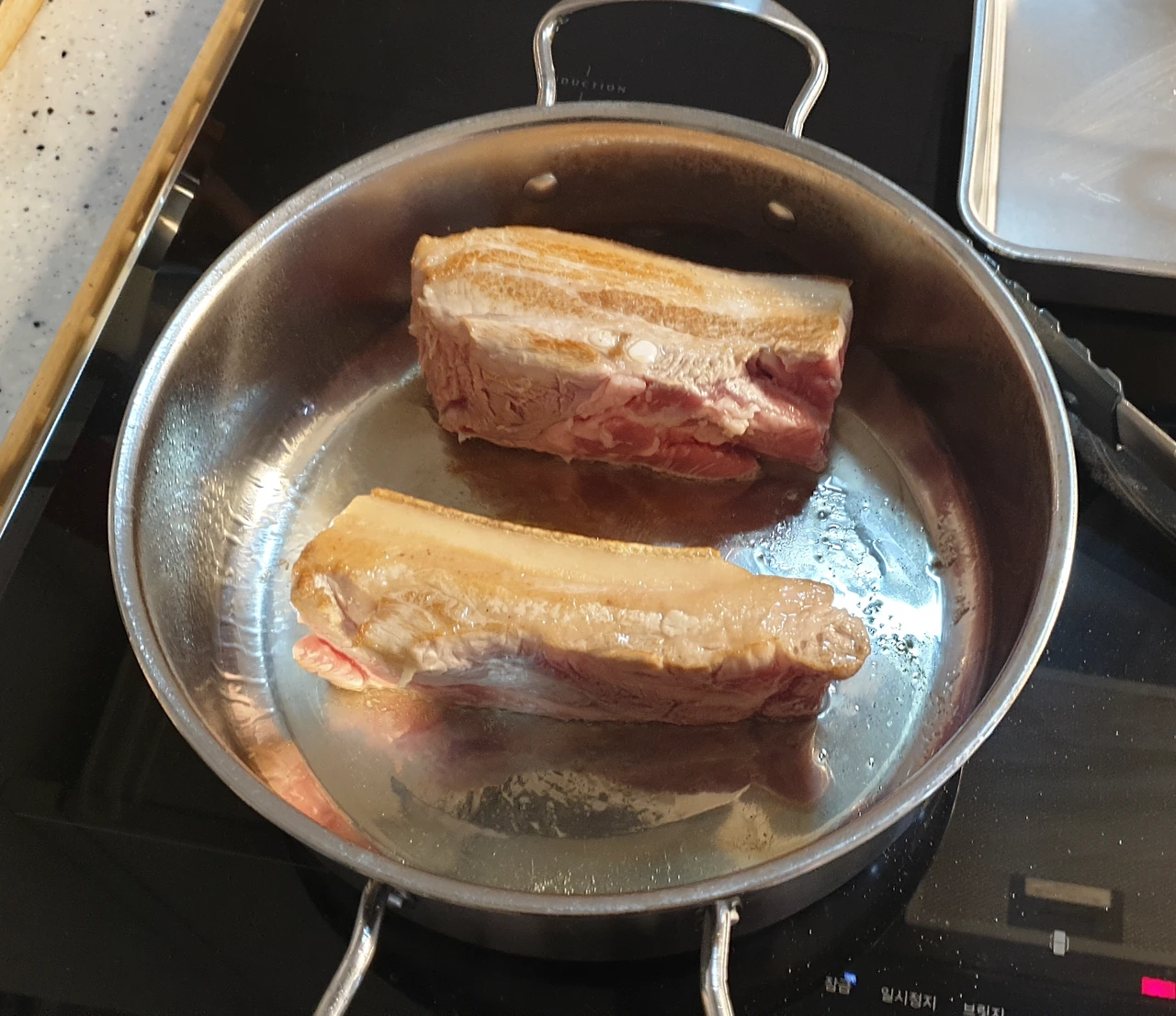기름을 살짝 두르고 껍질 부분부터 고기를 얹혔다. 껍질 부분은 자글자글 익기 시작하더니 조금 쪼그라든다. 그 뒤에 고기 양 옆면이 갈색으로 바삭바삭해질 때까지 구워준다.