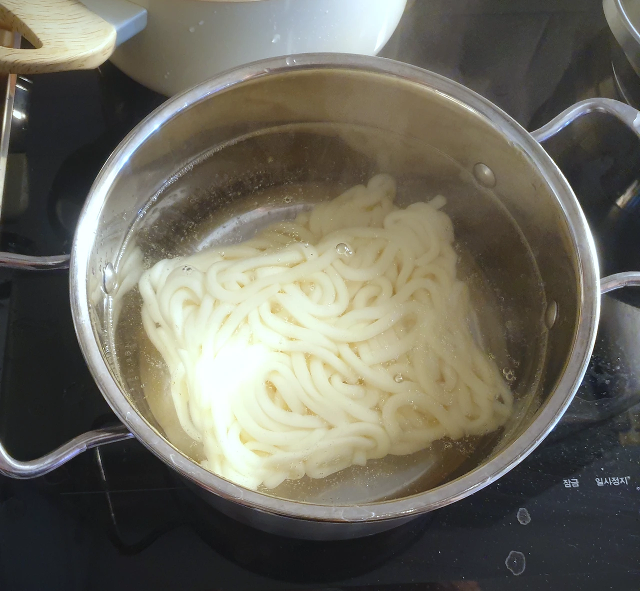 끓는 물에 2분 동안 우동면을 삶았다.