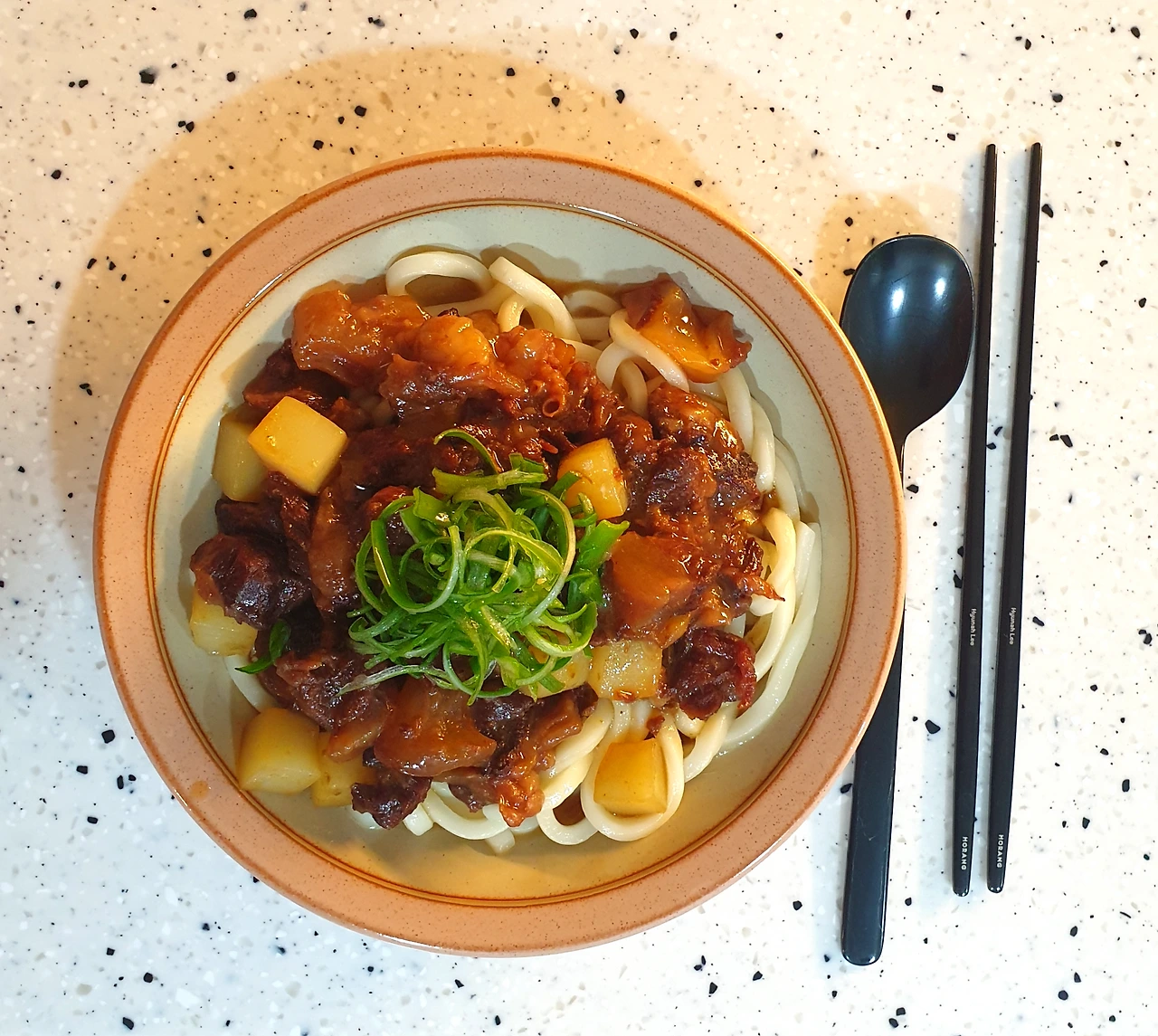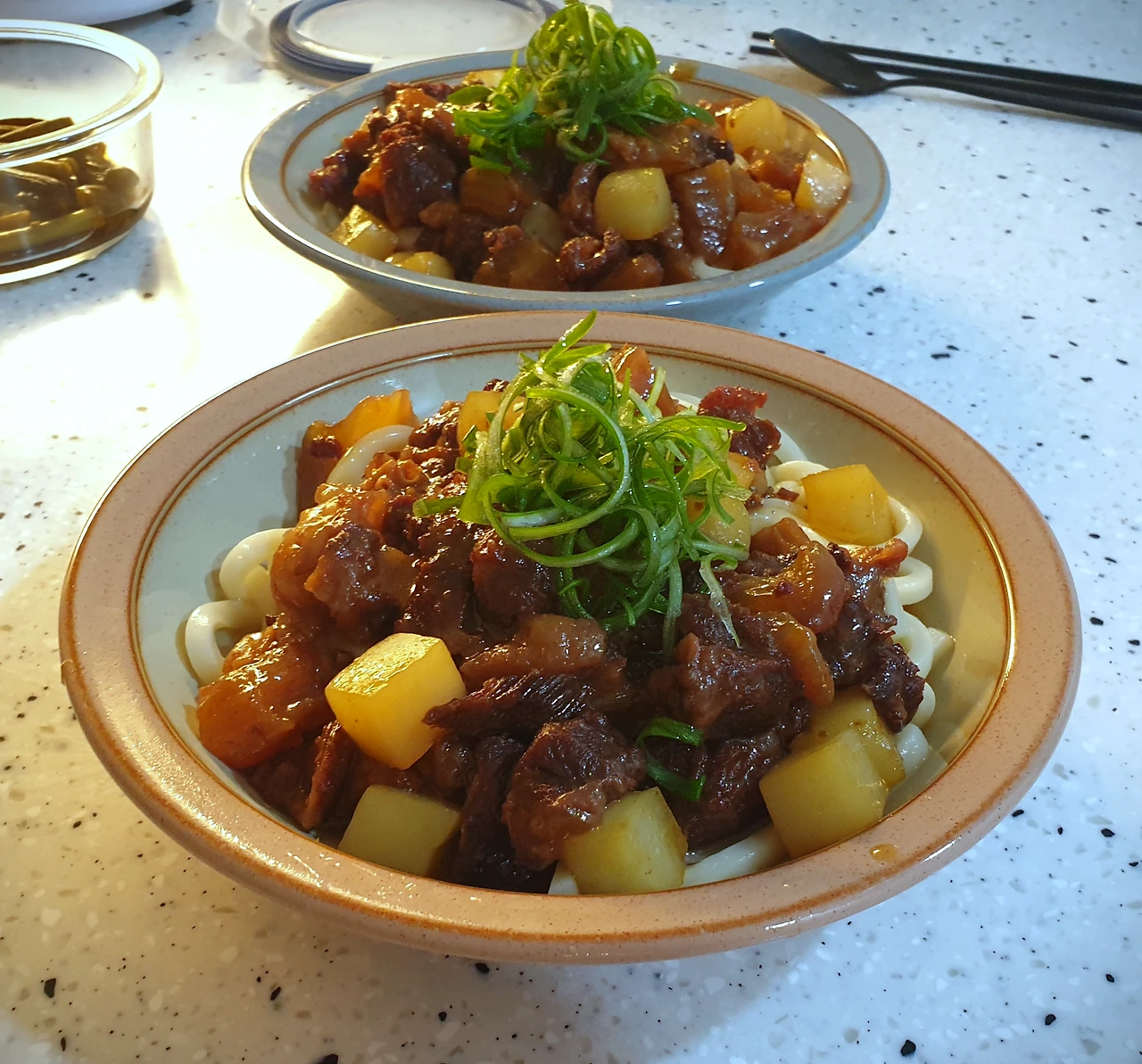 우동면 위에 조려진 스지를 얹고 그 위에 찬물에 담가 두었던 파채를 얹혀서 완성하였다.