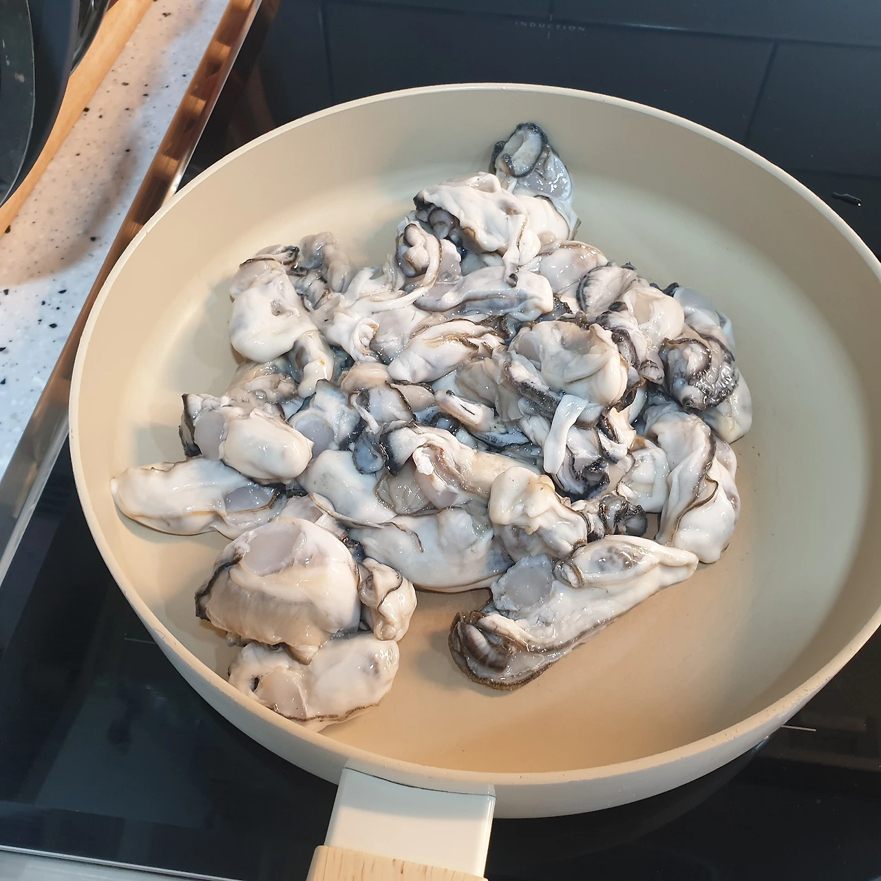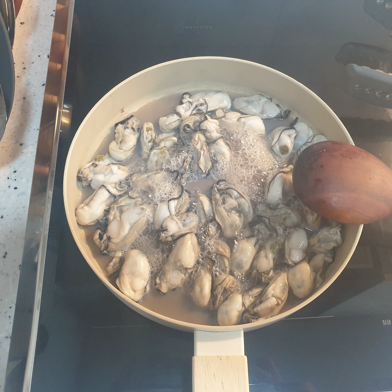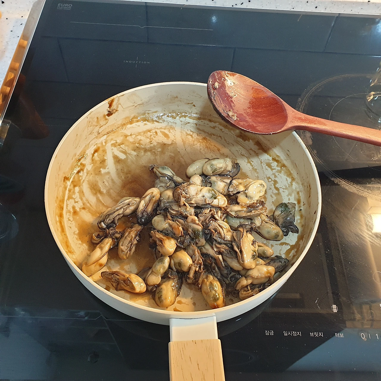 볶다 보면 물이 나온다. 그 상태로 굴 한쪽 면이