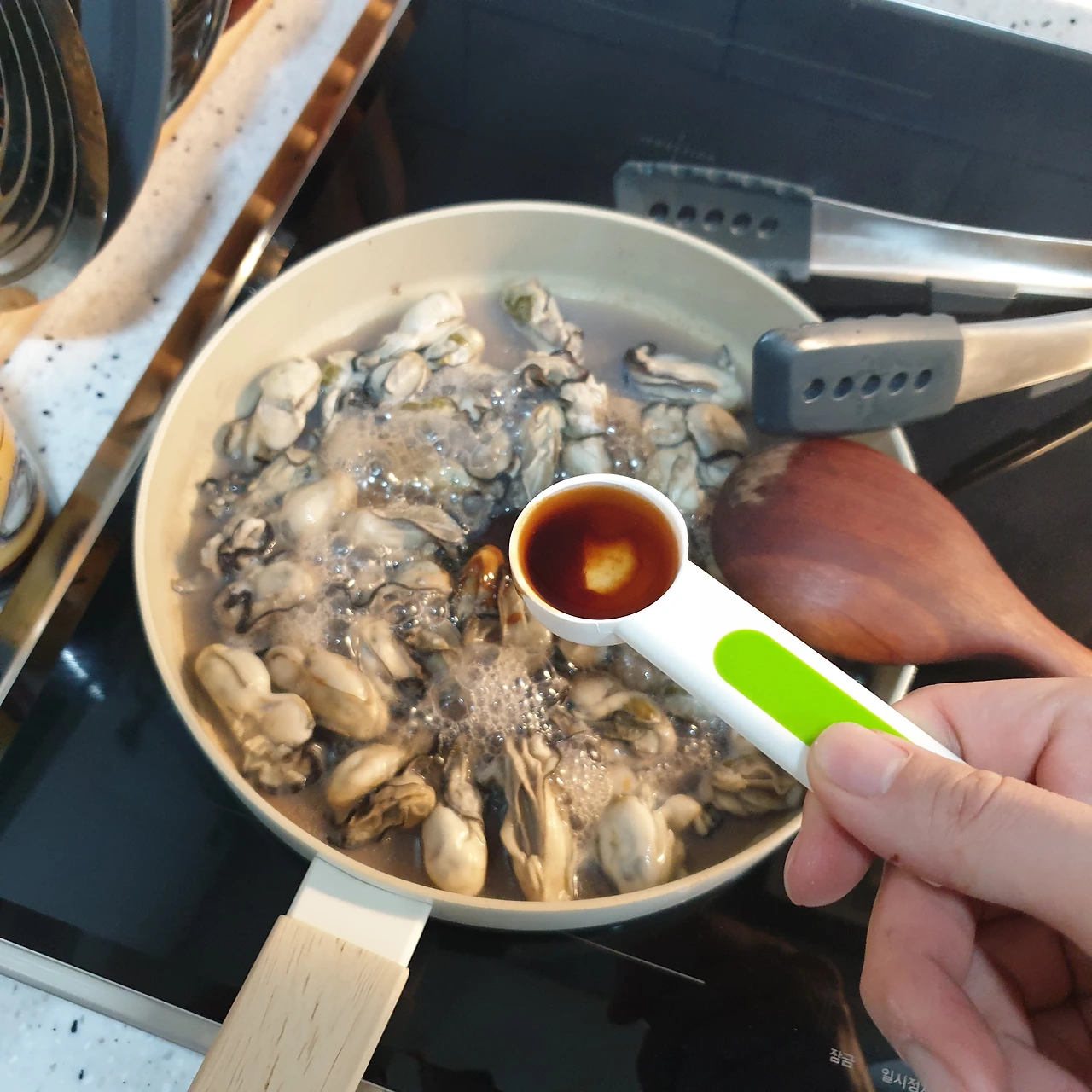뒤집고 나서 굴에 굴소스 1Ts를 넣는다.