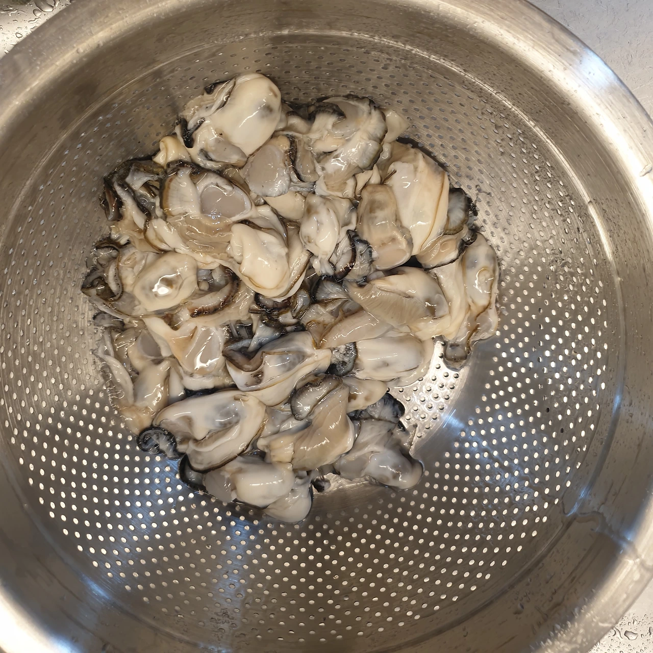 굴을 뜰채에 넣고 소금 1Ts 넣고 박박 씻어주었다.