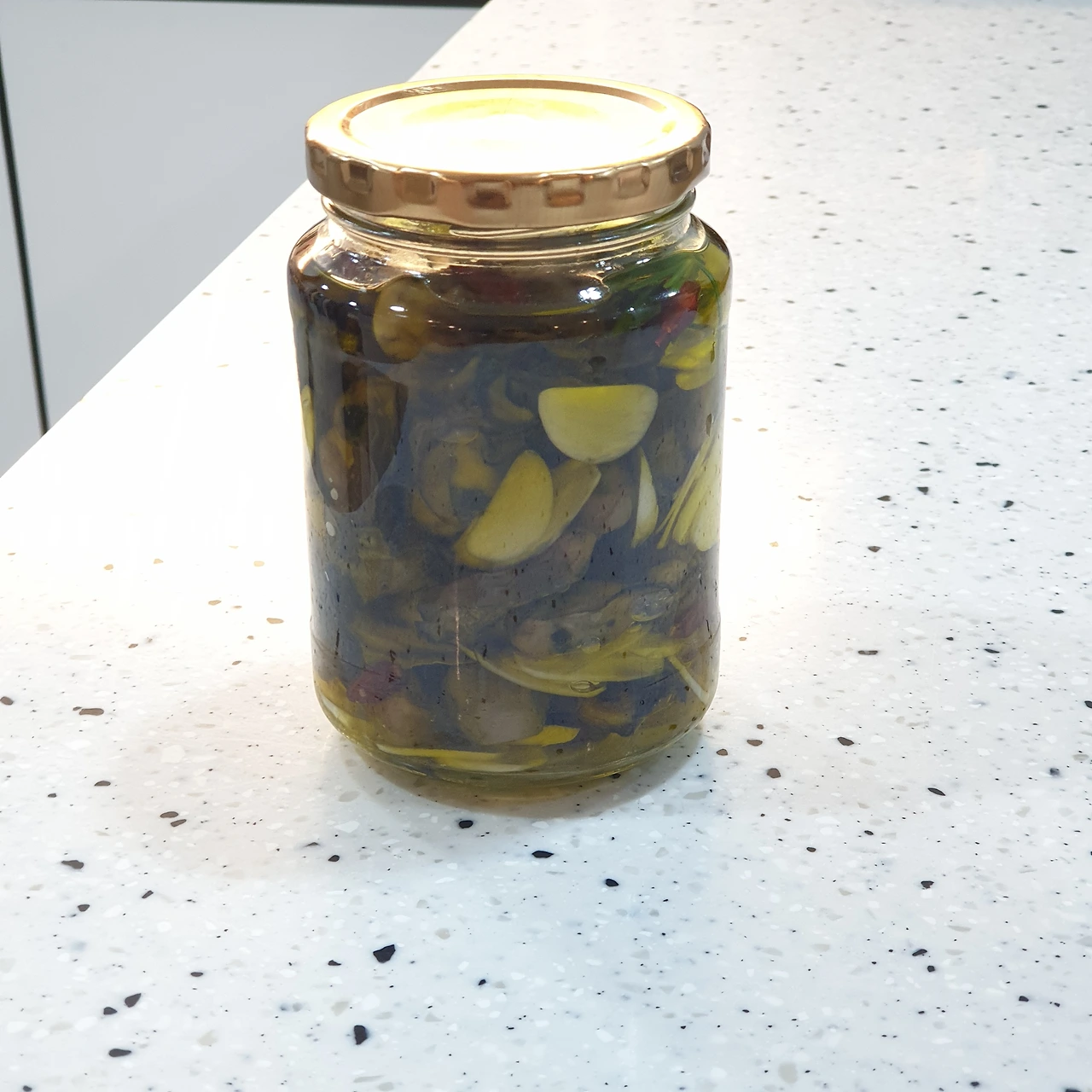 골고루 넣고 맨 위에 로즈마리 하나를 얹히고 올리브유로 꽉 채워주면 완성이다.