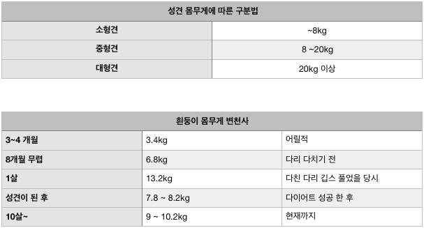 7살이 넘어가면서 흰둥이의 몸무게는 소형견과 중형견의 경계선에서 왔다 갔다 했다. 계절의 특성상 운동량이 적은 겨울에는 8kg이 훌쩍 넘어갔다. 괜한 걱정이라고 할 수 있지만 흰둥이는 다리 관절이 좋지 않아 체중관리가 필수적이다. 병원에서도 나이와 활동량, 식습관 등 여러 가지를 고려해 볼 때 몸무게는 9kg을 넘지 않는 것이 바람직하다고 권하고 있다.