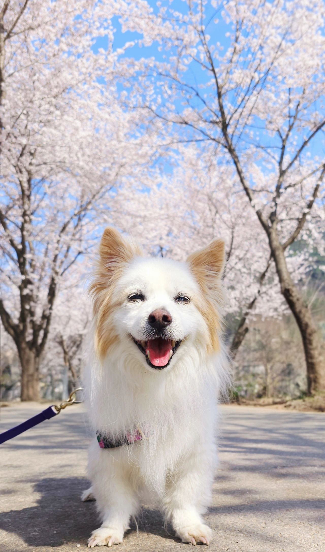 그러던 어느 날, 흰둥이와 산책길에 흐드러지게 핀 벚꽃이 눈에 들어왔다. 꽃잎이 떨어지는 소리도 들릴 듯한 오후에 흰둥이는 나무 아래 멈춰 서서 흙냄새를 맡고 있었다. 나는 얼른 카메라를 들었고 흰둥이는 고개를 들어 나를 바라봤다. 아주 짧은 숨결처럼 흐드러진 꽃잎 아래에서 마주한 눈빛과 미소가 찰나의 사진 속에 머물렀다. 그 순간이 내 마음속에 오래도록 남았다.