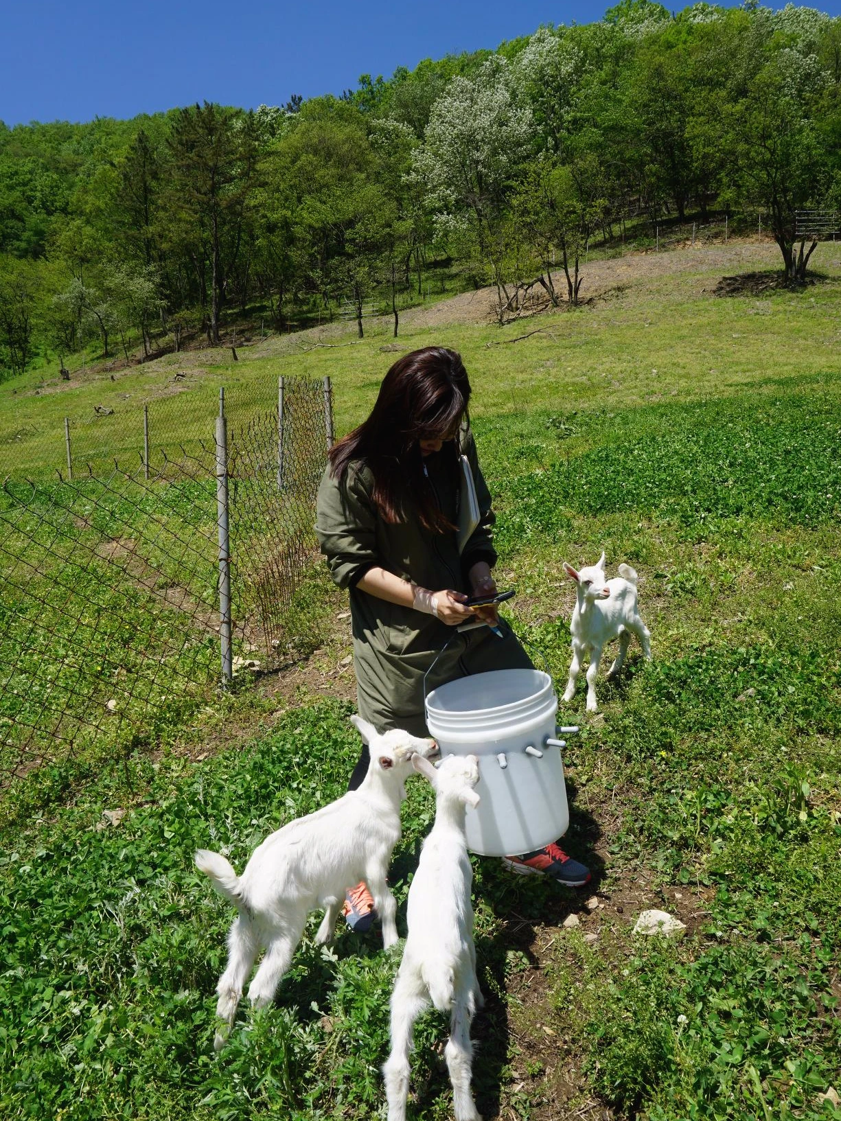 사진을 찍기 위해 녀석 중 몇 마리를 우리에서 풀어준다. 꺼내놓자마자 통제불능의 신난 망아지들이 되어버린다. 사방팔방 뛰어다니는 통에 도저히 잡을 수가 없다. 목장 주변에 걸릴 것도 막을 것도 없으니 순식간에 눈앞에서 사라져 버린다. 당황한 나를 보고 주인장은 껄껄 웃으며 녀석들을 홀릴 수 있는 극강의 무기를 쥐어준다. 우유통! 우유통을 들자마자 갑자기 피리 부는 사나이라도 된 듯 산양들이 내 주위로 몰려든다. 이리로 가면 이리로 따라오고 저리로 가면 저리로 따라오고. 내가 든 것이 빈 우유통이란 걸 눈치채기 전에 얼른 사진 몇 장을 찍는다. 빈 우유 꼭지를 신나게 빨아대는 모습이 귀엽기도 하고 짠하기도 하다.