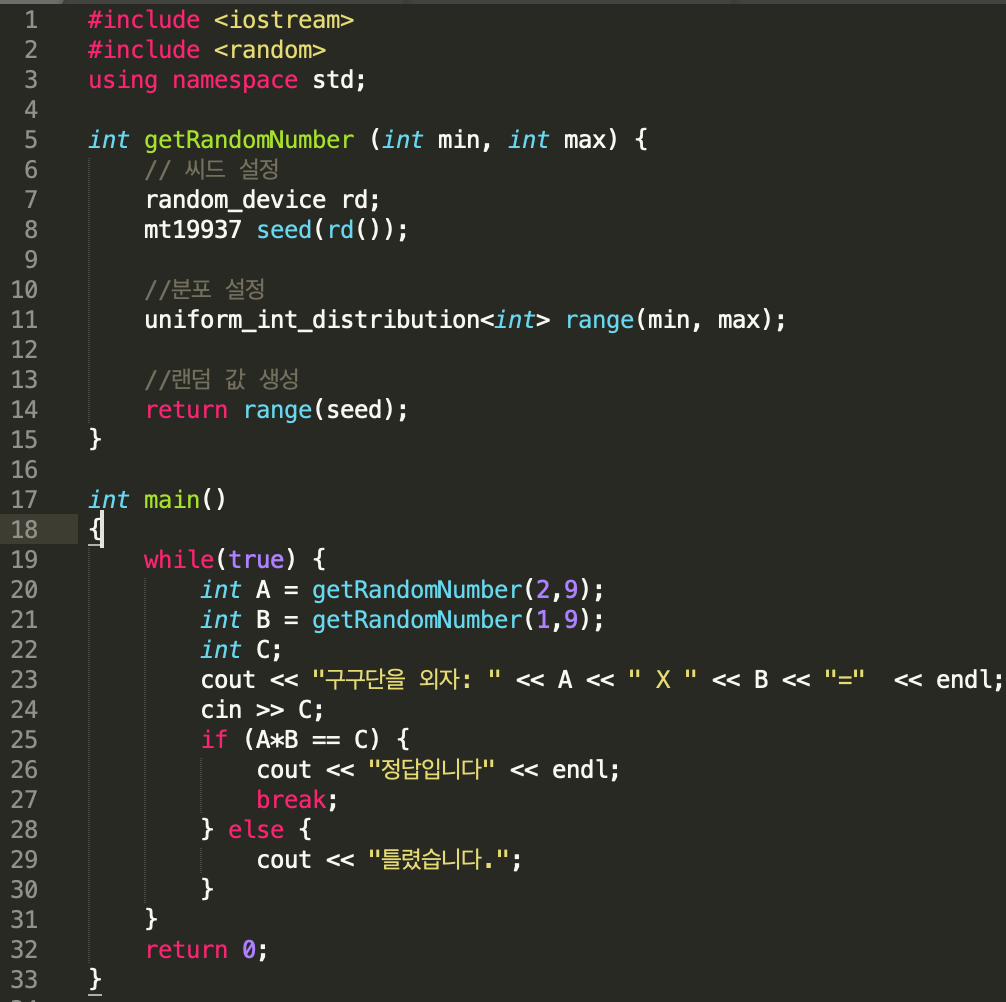 각 언어마다 랜덤 한 수를 만드는 방법은 다르다. C++은 random 라이브러리를 이용하면 되는데 조금 복잡하다. 그냥 가볍게 함수를 만들어서 쓰자. 굳이 이해할 필요 없다. 필요한 기능은 구글이 해결해줄 것이다.
