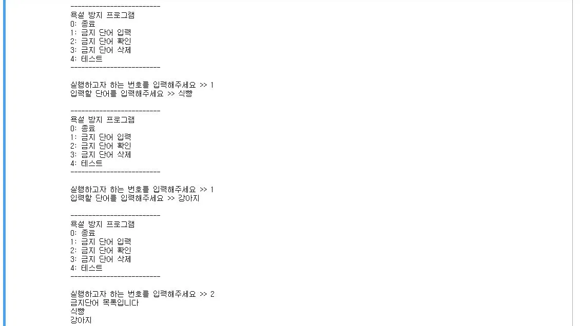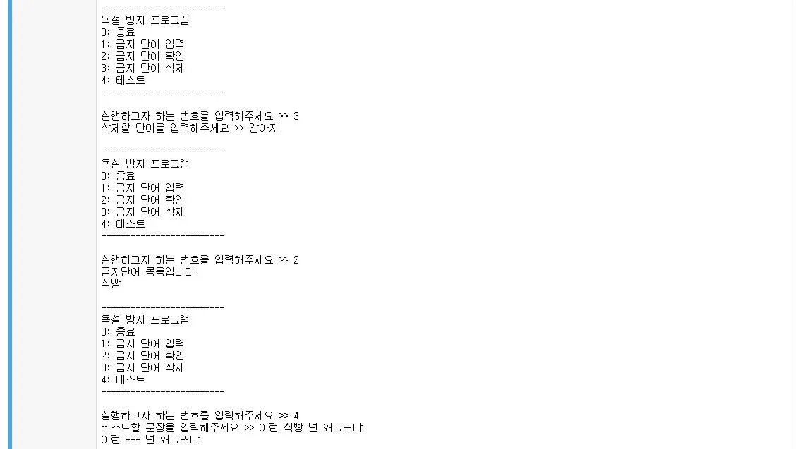 4를 입력하면 금지어가 테스트 문자열에 포함되어있는지 확인한다.