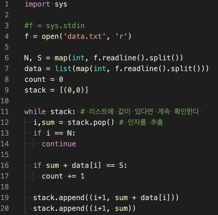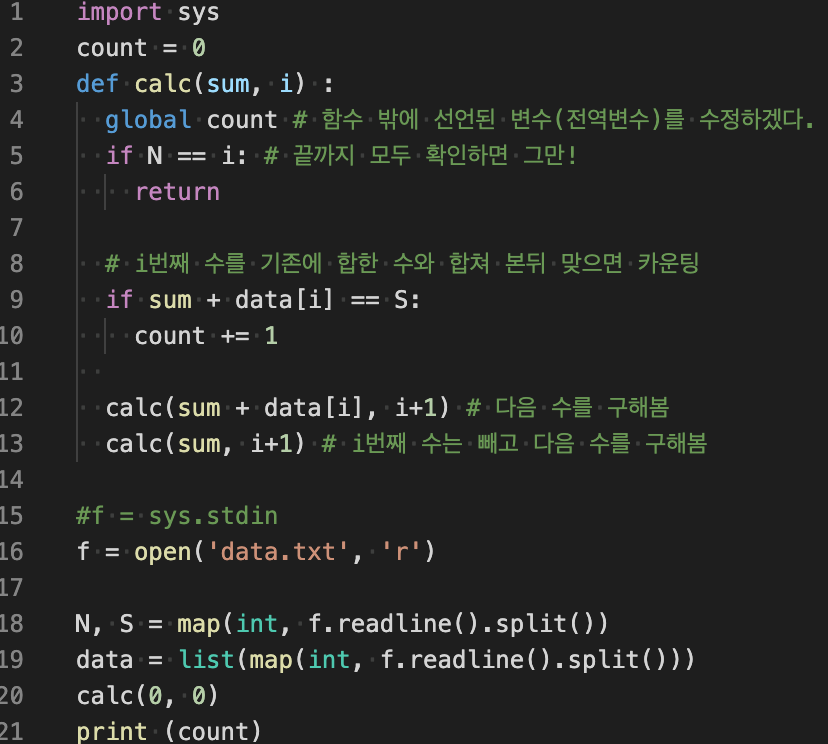 숫자 N개 중 몇 개를 뽑아 합이 S가 되는 조합의 개수를 찾아라