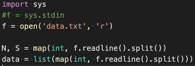 백준에 제출할 때는 f = sys.stdin 주석을 풀고 f = open('data.txt', 'r')에 주석 처리하면 된다.
