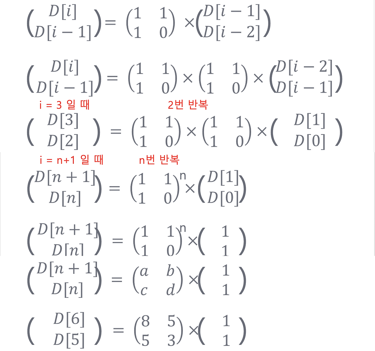 이렇게 하면 단순 제곱의 연산으로 피보나치수열의 값을 구할 수 있다. 추가적으로 더 성능을 향상시킬 수 있는데 이 부분은 더 어려워지므로 패스하겠다.
