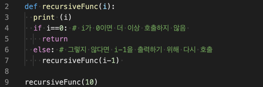 메인에서 recursiveFunc(10) 함수를 호출하면 이 함수가 recursiveFunc(9)를 다시 호출한다. 그리고 i가 0이되면 그만 호출하면 프로그램은 종료된다.
