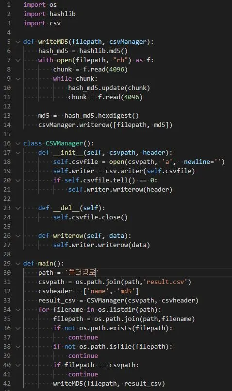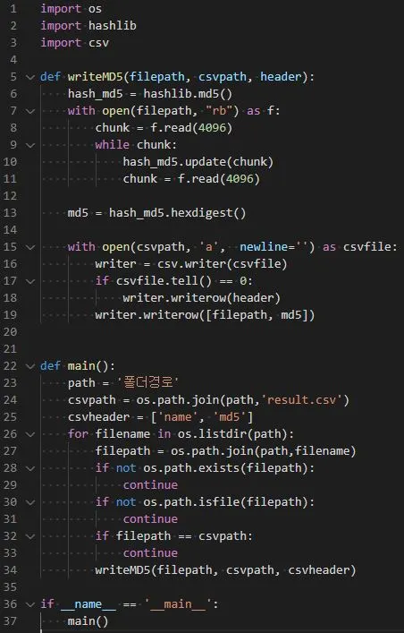 특정 폴더 경로를 입력받아 파일들의 hash를 구하고 csv 파일에 작성하는 코드를 구현해보자