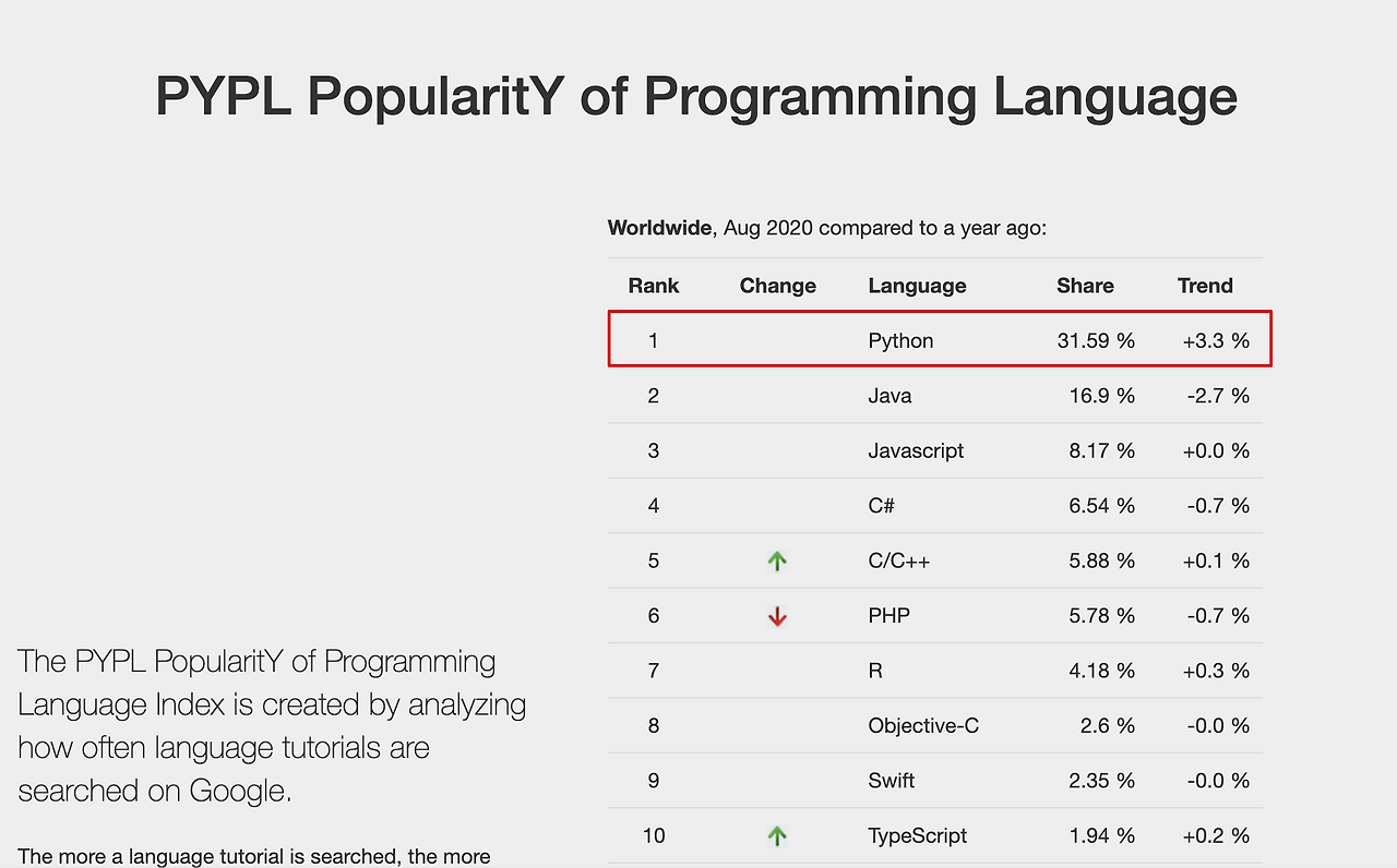 파이썬은 정말 쉬운 언어이다. 프로그래밍 언어를 배우기 위해 구글에 가장 검색을 많이 하는 언어이다.